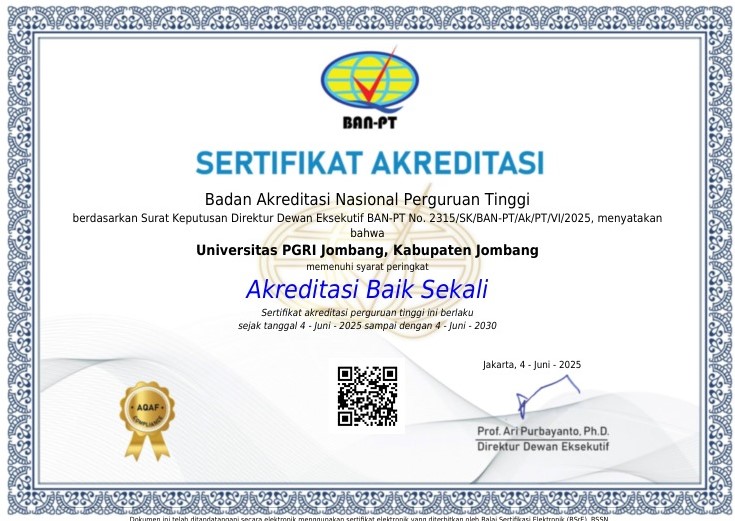 Sertifikat Akreditasi Institusi dari tahun 2015-2025 (STKIP PGRI Jombang-Universitas PGRI Jombang) bisa diakses pada link berikut: https://drive.google.com/file/d/1IINl5I4X5XnYsAVrXZHCfwtF7wfsYGRy/view?usp=sharing